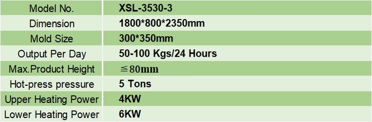 The Model XSL-3530-3 equipment uses three templates and the molds are automatically transferred. It is used for small-batch production and product sampling. The complete production line of the standard configuration includes: pulp-mixing pump, cold vacuum pump, hot vacuum pump, pulp-refluxing pump, pulping machine, pulp-mixing bucket, pulp-refluxing bucket, vacuum water-refluxing tank and trimming machine.